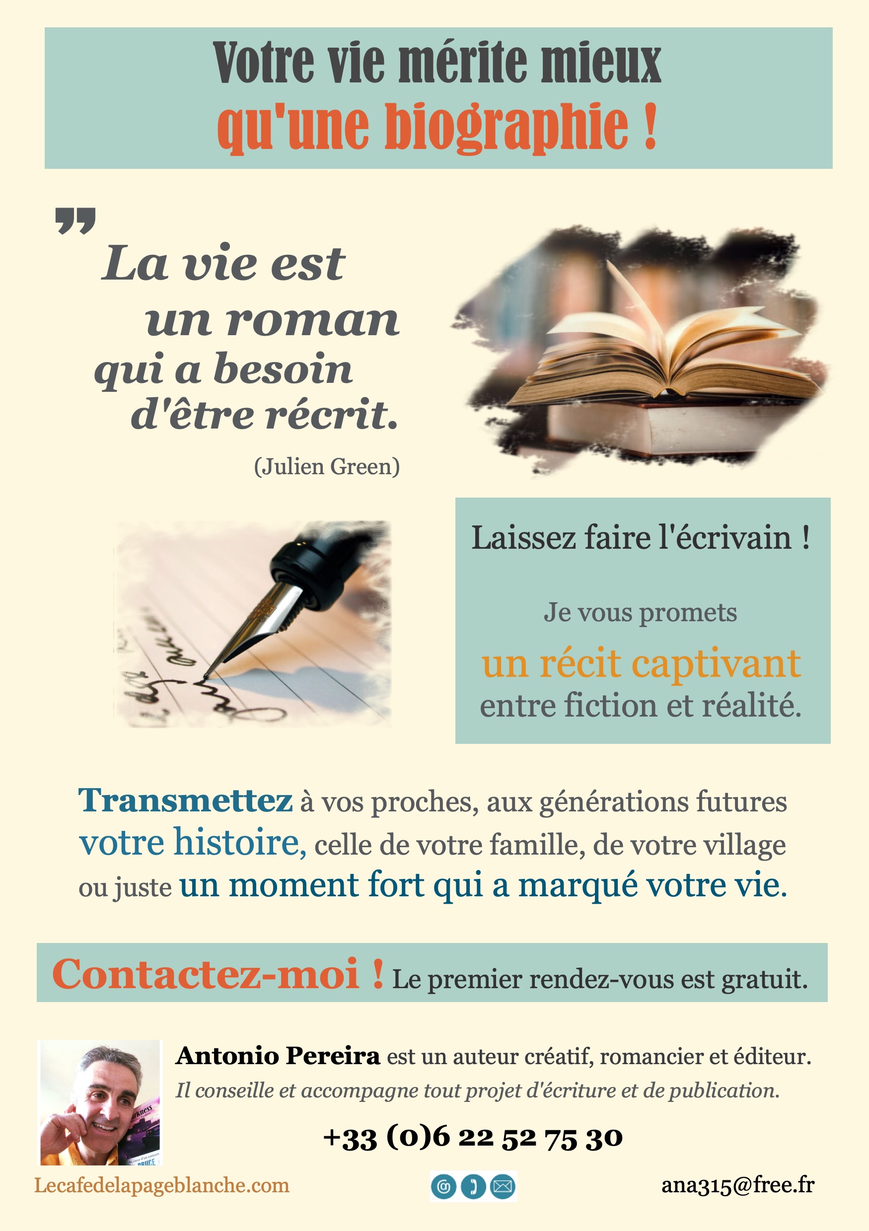 Sur la base de vos écrits, je façonne le récit selon la trame définie ensemble, lors du premier rendez-vous (gratuit).